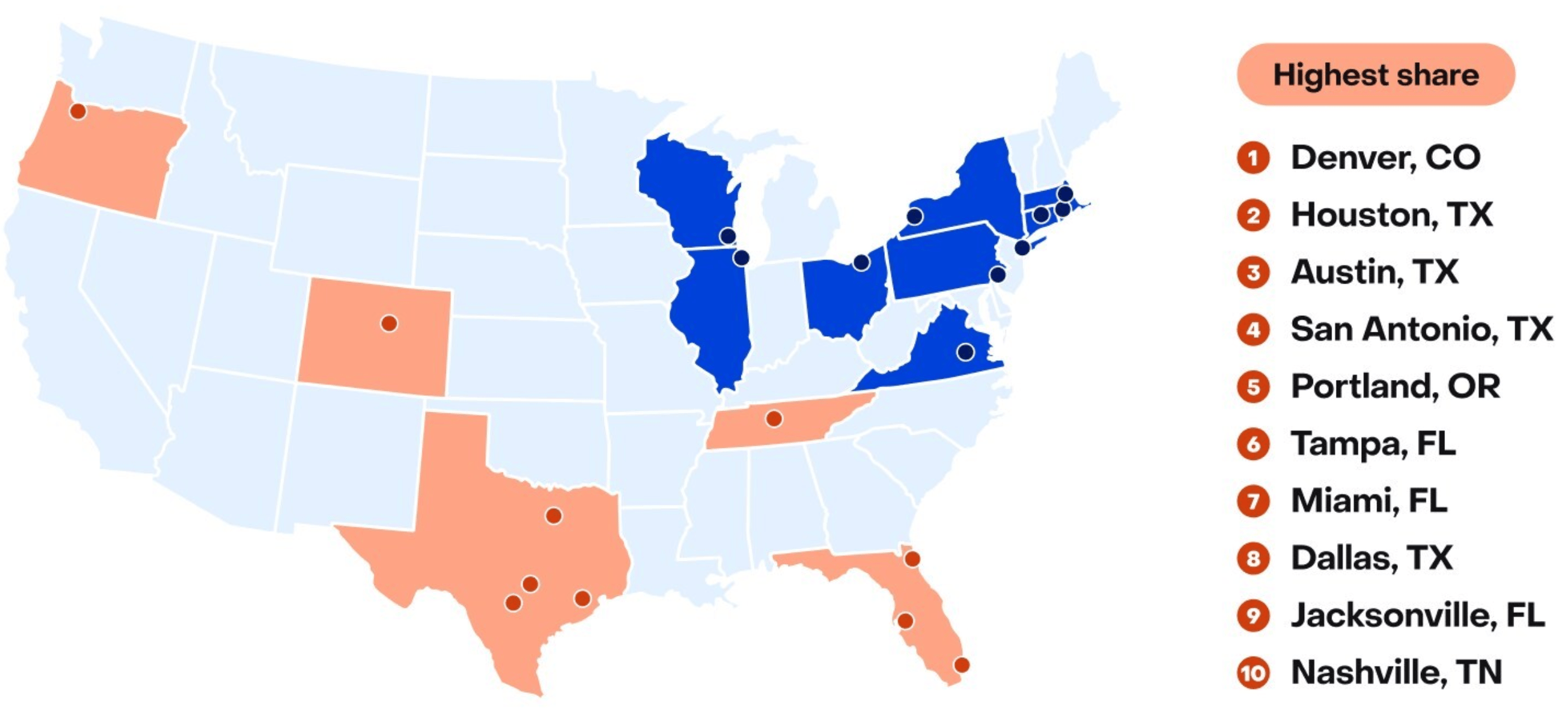 Among the top five metros with the highest share of accidental landlords, three are in Texas: Houston (4.2%), Austin (4.1%), and San Antonio (3.9%).