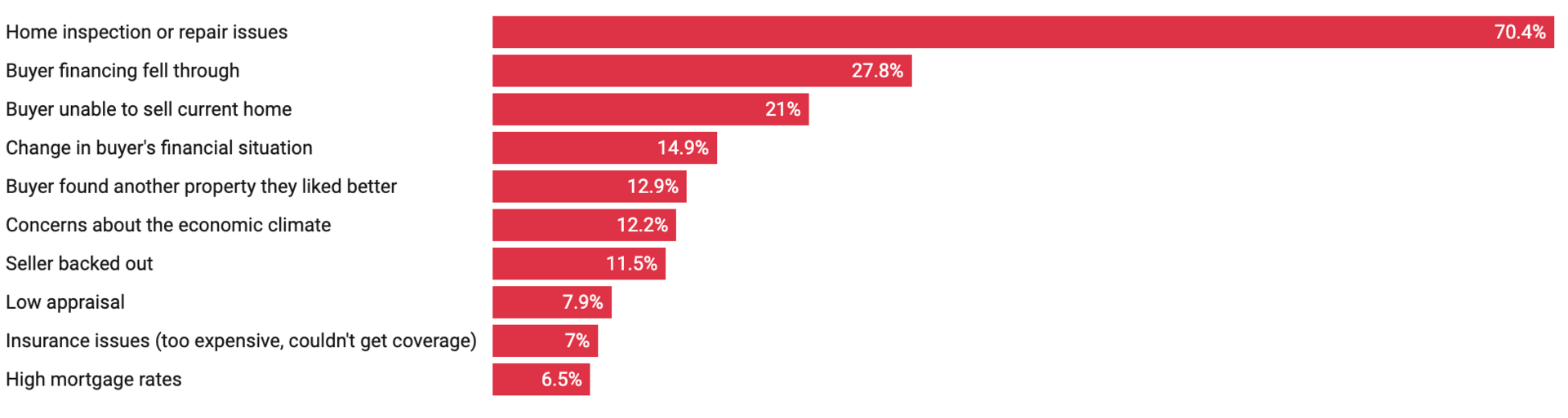 Among the 443 agents interviewed who had dealt with a cancellation in the past three months, 70.4% said home inspection or repair issues were the top reason for home-purchase cancellations.